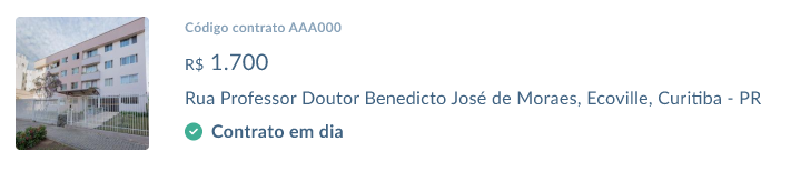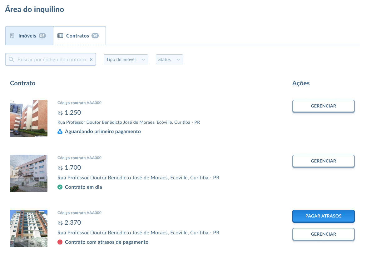 Na aba de imóveis você vai ver os contratos que você está como inquilino. Contratos que já rescindiram serão mostrados no final da lista.