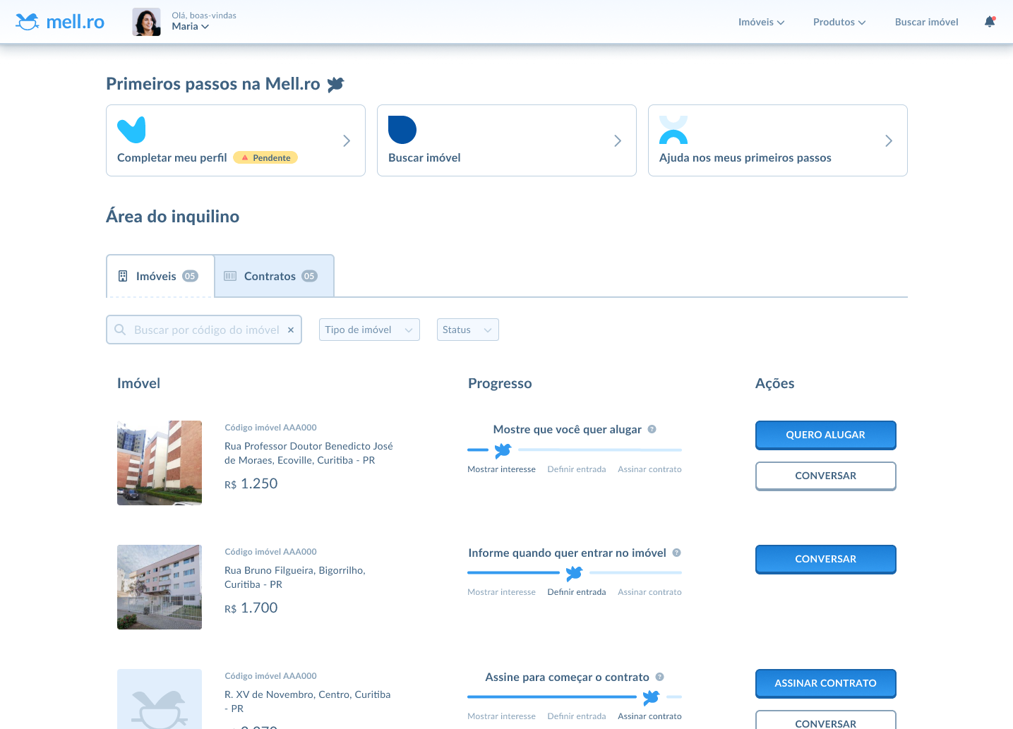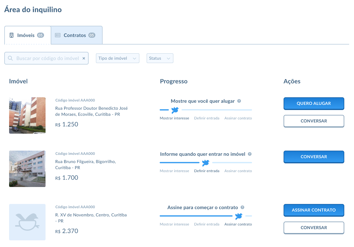 Na aba de imóveis você vai ver os imóveis que você se interessou e está negociando como inquilino o contrato de aluguel. A partir do momento que um imóvel tiver um contrato vigente, não será mais exibido aqui.