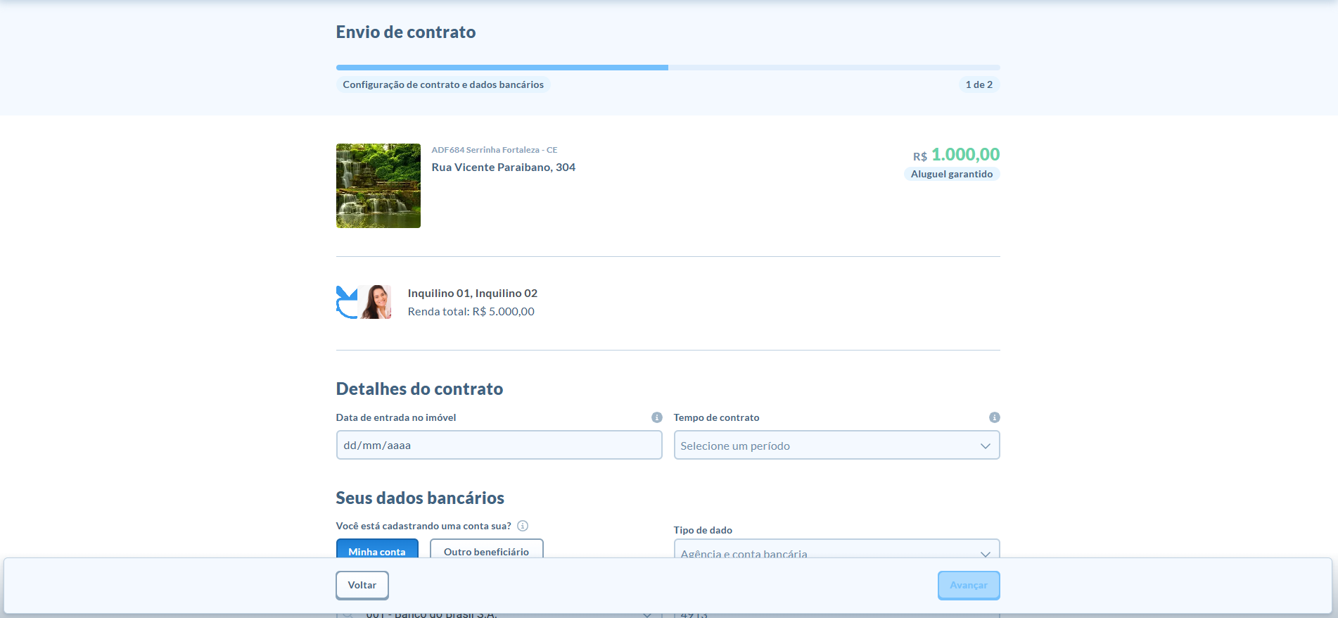 Na primeira tela, você define as regras do contrato e informa seus dados de pagamento: