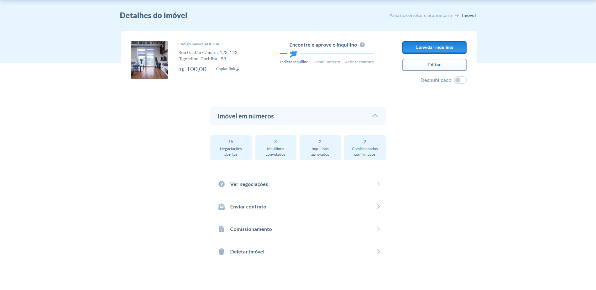 Convidar inquilino: Inicia o fluxo para você chamar interessados e dar o próximo passo na negociação, levando você para a tela de convite.